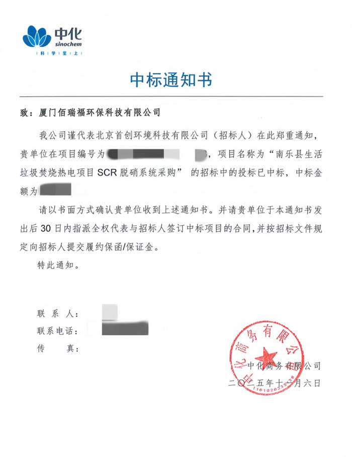 近日,厦门佰瑞福环保科技有限公司凭借卓越的综合实力,成功中标北京首创环境科技有限公司“南乐县生活垃圾焚烧热电项目SCR脱硝系统采购”项目,为公司于环保科技领域再添一项重要业绩。